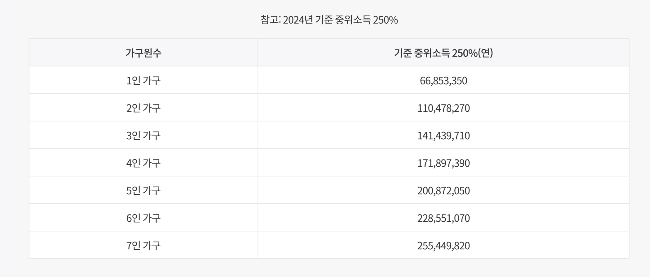 | 가구소득 | 중위소득 250% 이하 (4인 기준 약 1,432만 원/월) |