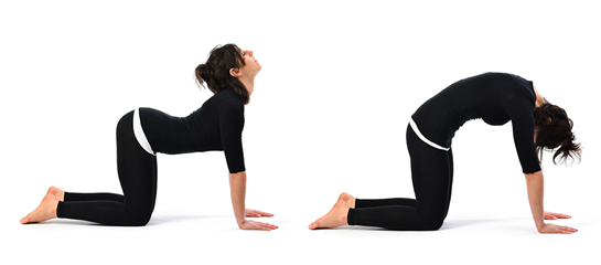 고양이-소 자세 등을 둥글게 말았다가 아래로 꺾으며 고개 들기 척추 유연성 회복, 요통 예방