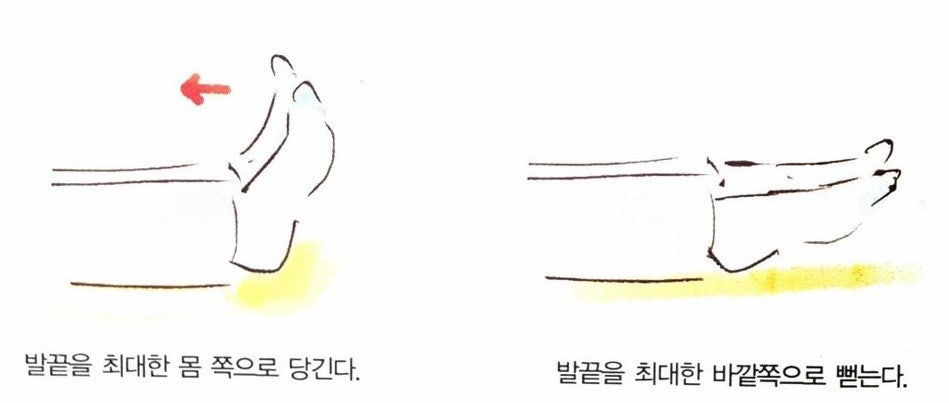 발끝 당기기 누워서 발끝을 몸 쪽으로 당김 정맥 순환 자극