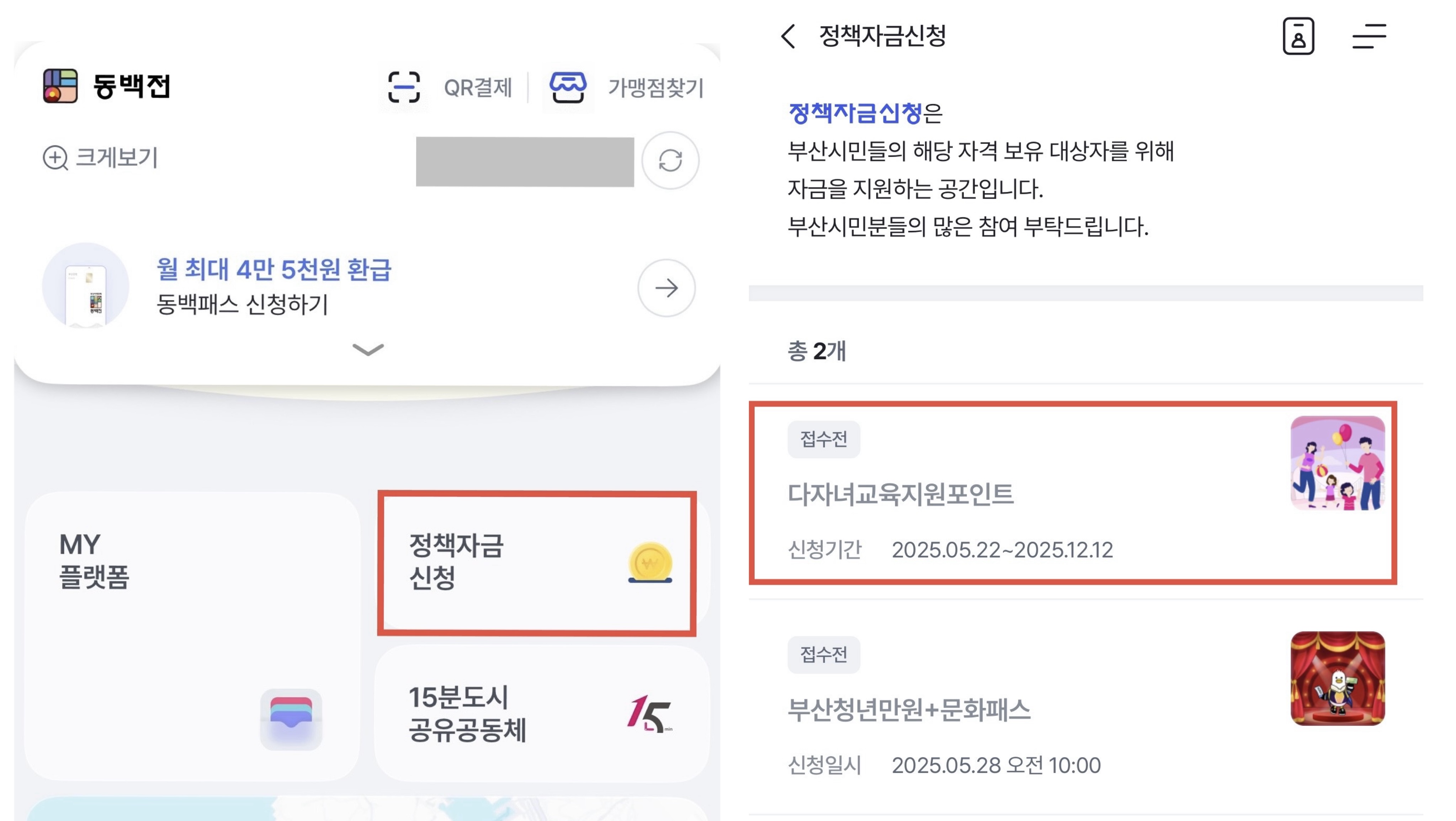 동백전 앱 실행 > 정책자금 신청 > 다자녀 교육지원포인트