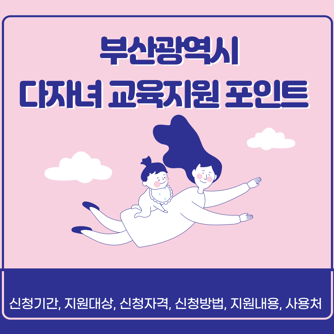 부산시에서 시행하는 '다자녀 교육 지원포인트'는 두 자녀 또는 세 자녀 이상을 둔 가정의 교육비 부담을 덜기 위한 지역 맞춤형 지원제도입니다. 지급된 포인트는 학습 교재구입, 예체능 교육시설, 독서실 등에 사용할 수 있습니다.